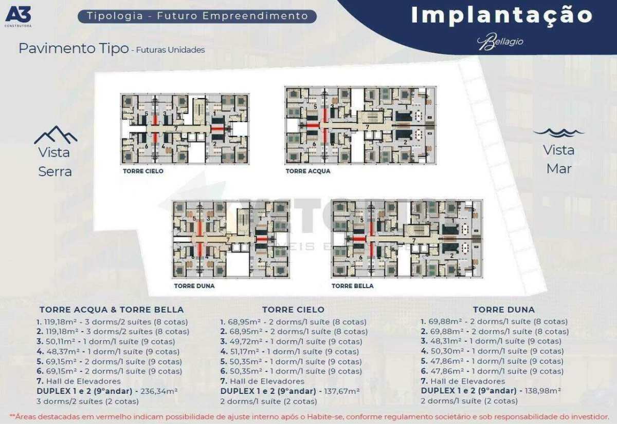 Apartamentos com 01, 02 e 03 dormitórios, todos com suítes